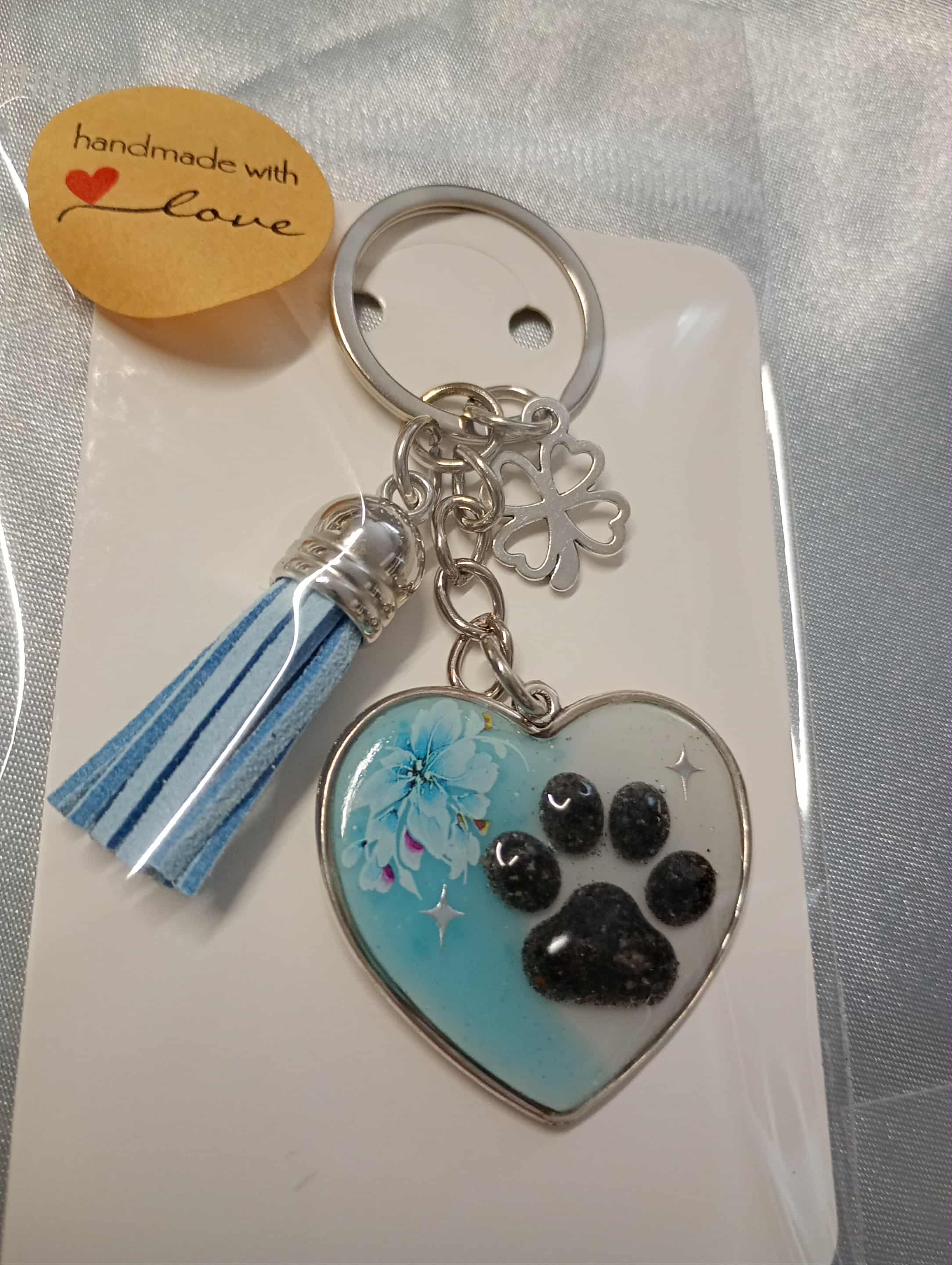 Epoxidová klúčenka v zliatinovom ráme v tvare  3,5 cm srdiečka, spravidla svetlá biela kombinovaná s ružovou, modrou ( podla želania aj iná farba ),do ktorej je zakomponovaná srsť alebo popol zvieratka. Spôsob uloženia srsti závisí od kvality a dĺžky srsti, popol v tvare labky alebo volne uložený. Súčasťou je decentné dozdobenie dekoračnými prvkami ako rôzne druhy perlete, kvietkov a trblietok, ktoré farebne prispôsobím preferenciám objednávateľa.