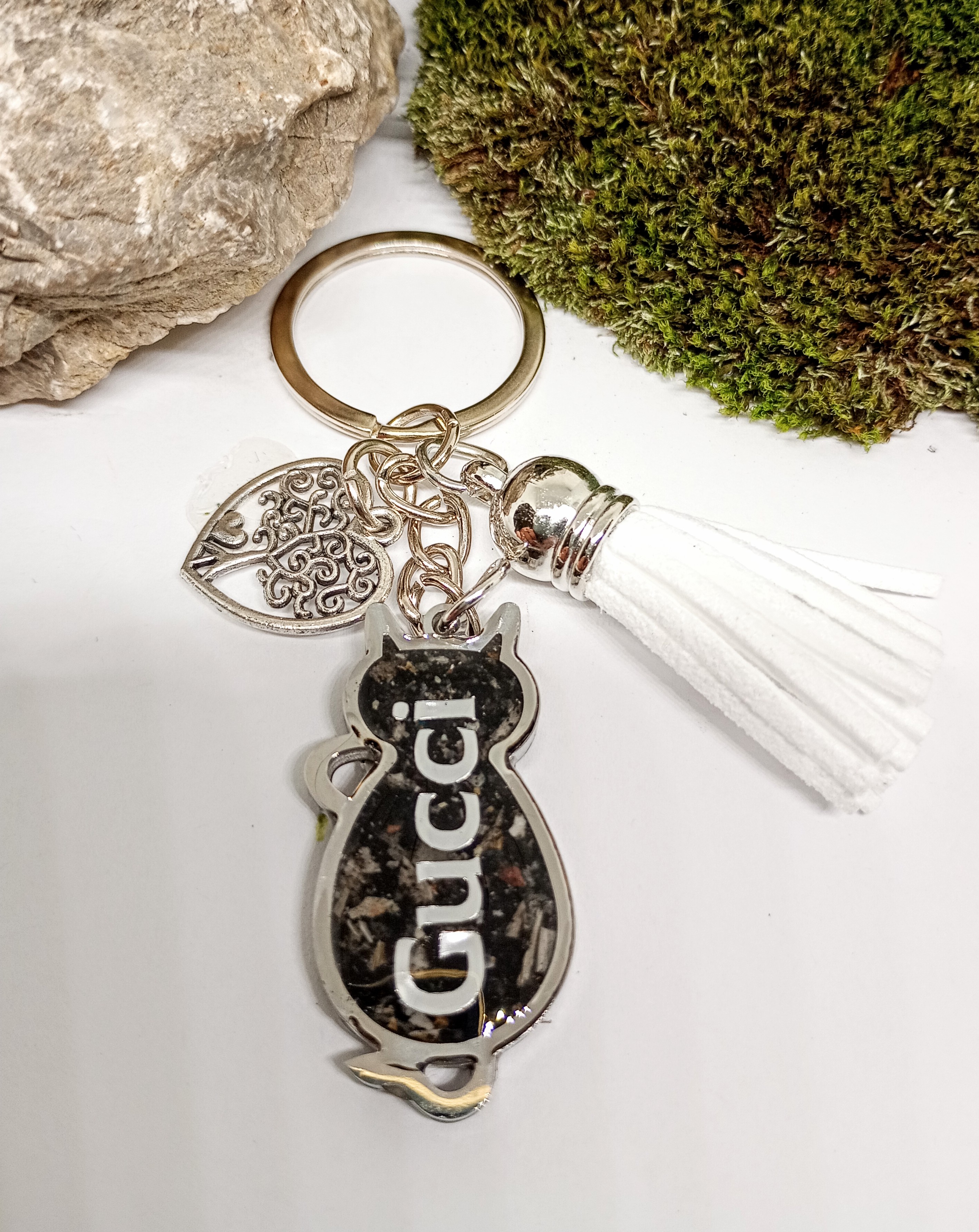 Epoxidová obojstranná klúčenka v tvarovanom ráme z ušlachtilej chirurgickej ocele, ktorá poskytuje priestor na kremačný popol aj malú vzorku srstičky a na opačnej strane je meno zvieratka. Meno sa zmenšuje podľa dĺžky mena, vzhľadom k veľkosti klúčenky sa uprednostňuje krajšia verzia mena bez zdrobňovania.