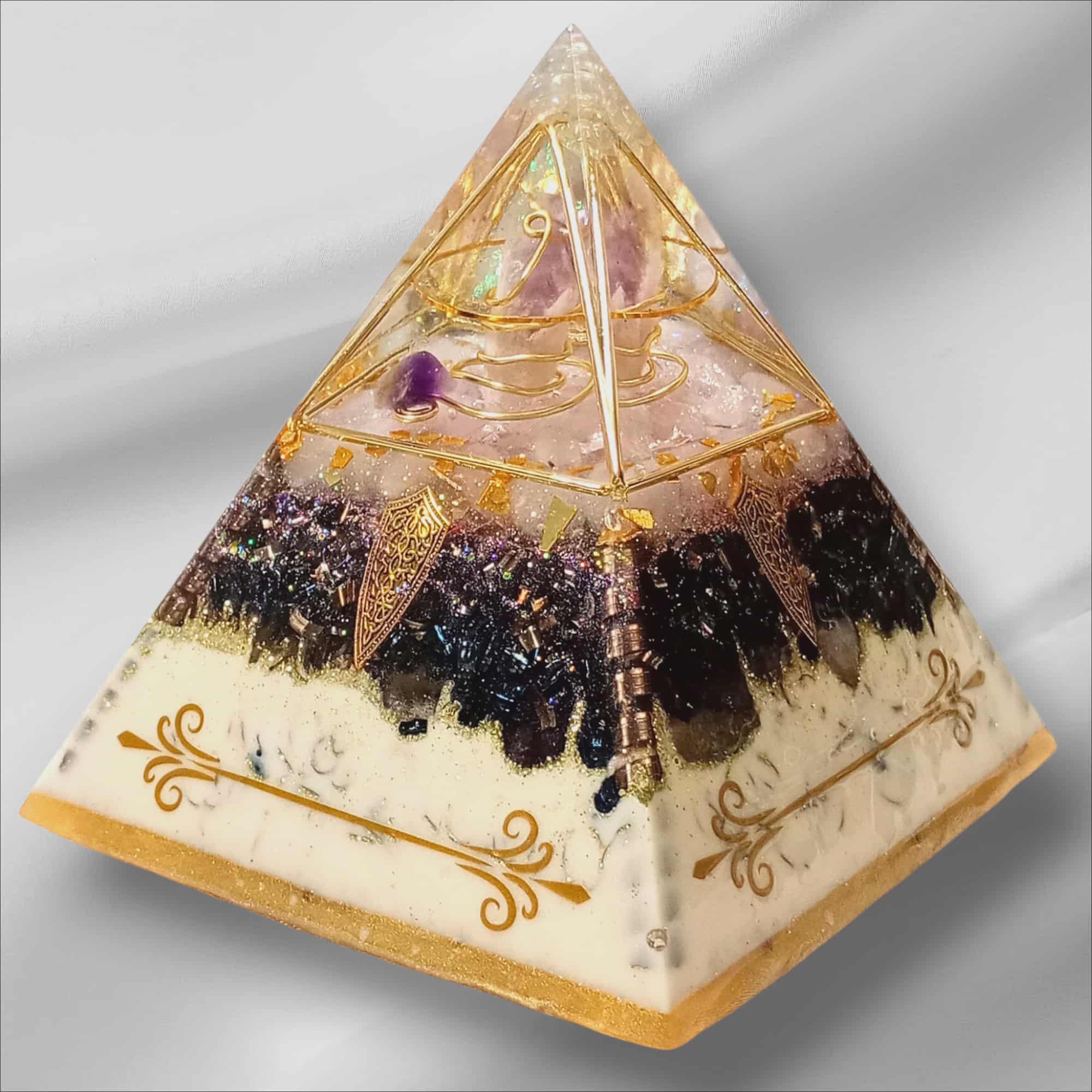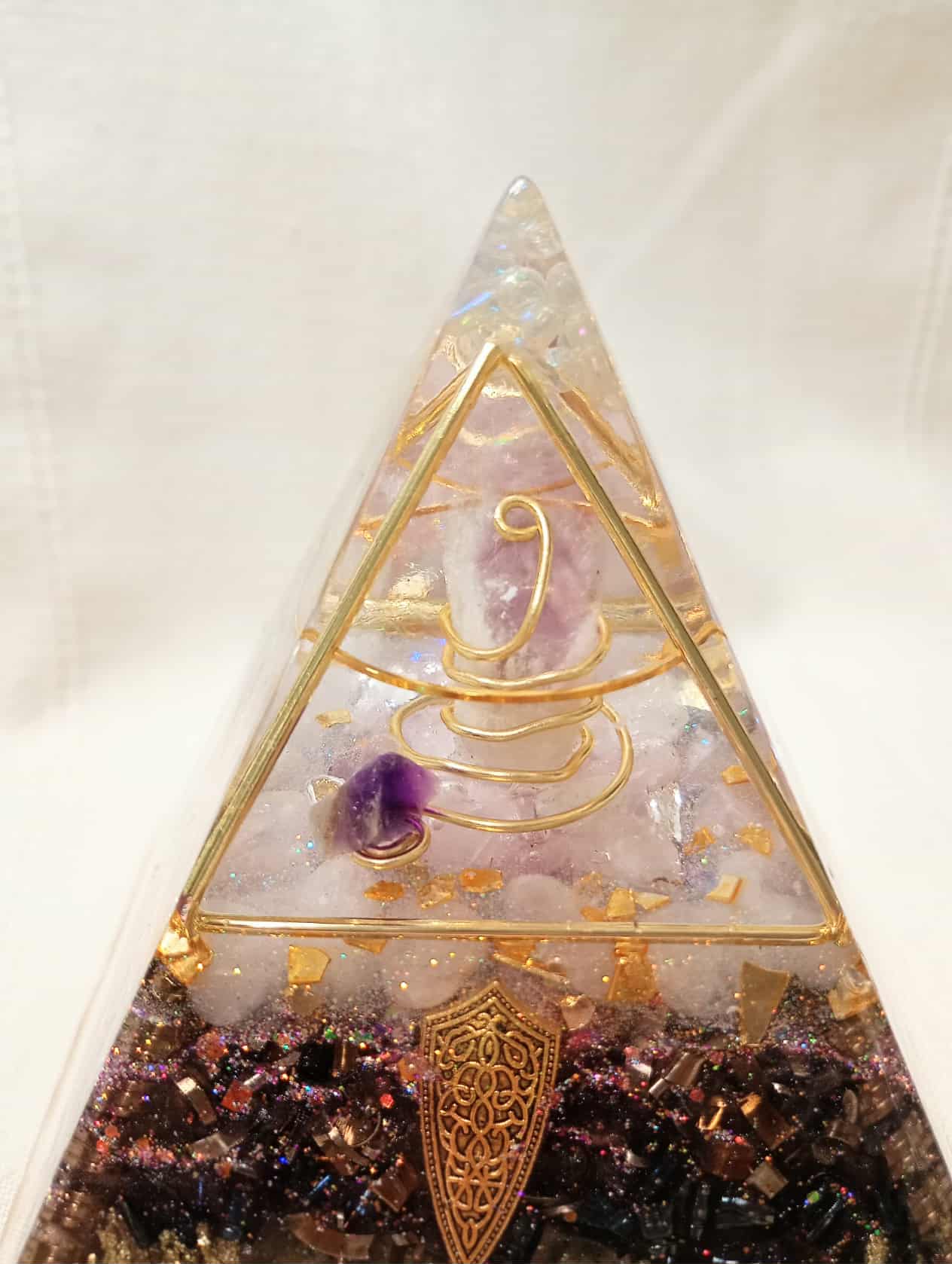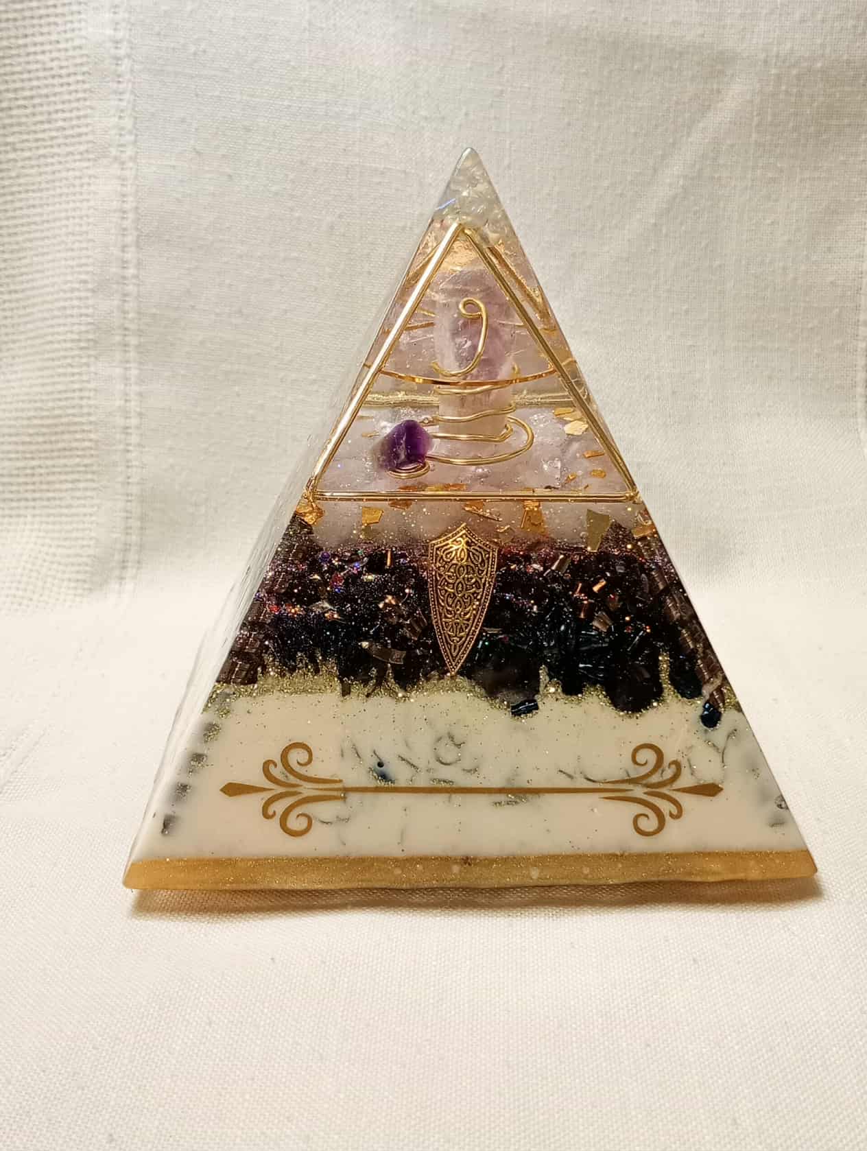 Nádherná a jedinečná autorská 12,5 cm orgonitová pyramída, v ktorej sa spája funkčnosť, moderný dizajn i nádych slovanstva.