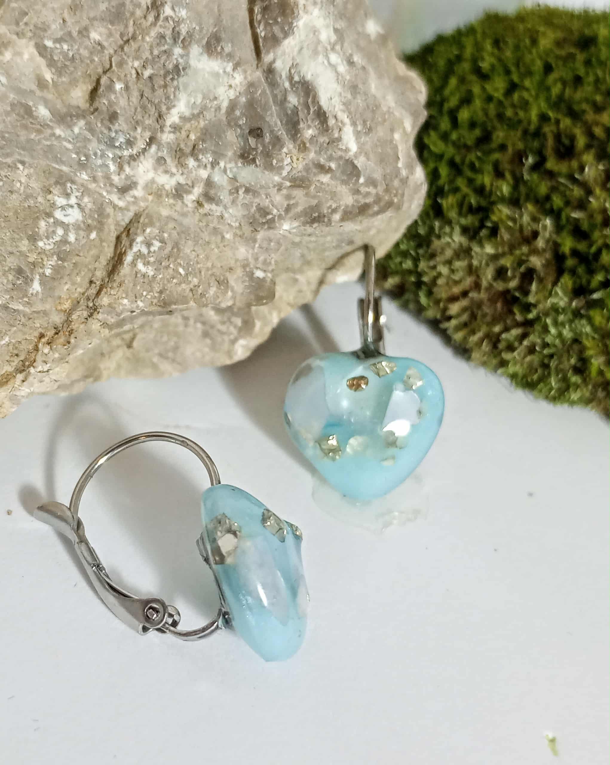 Ručne vyrobené náušničky z epoxidovej živice,  trblietok a drobného dekoračného materiálu. Zapínanie nerezové.