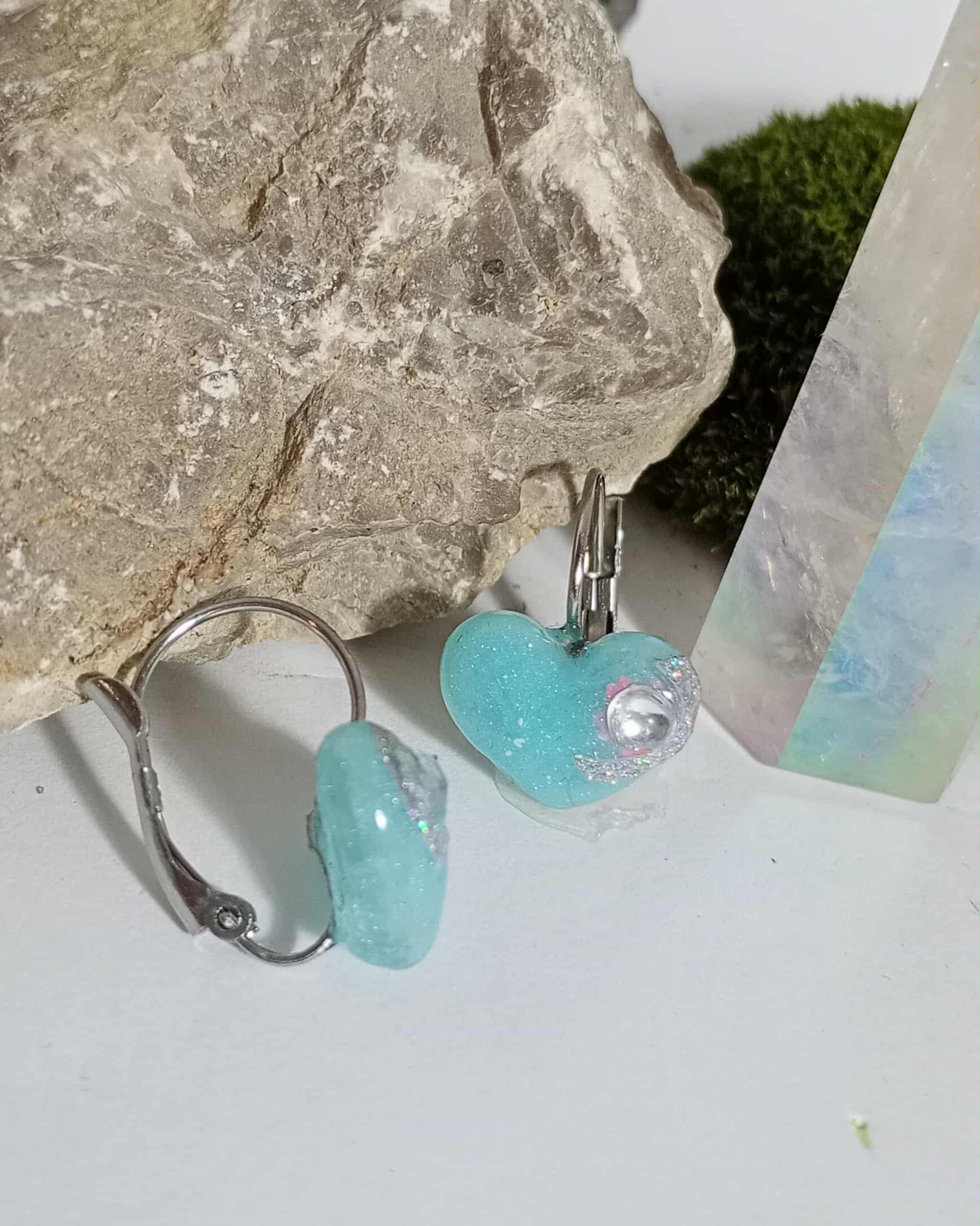 Ručne vyrobené náušničky z epoxidovej živice,  trblietok a drobného dekoračného materiálu. Zapínanie nerezové.