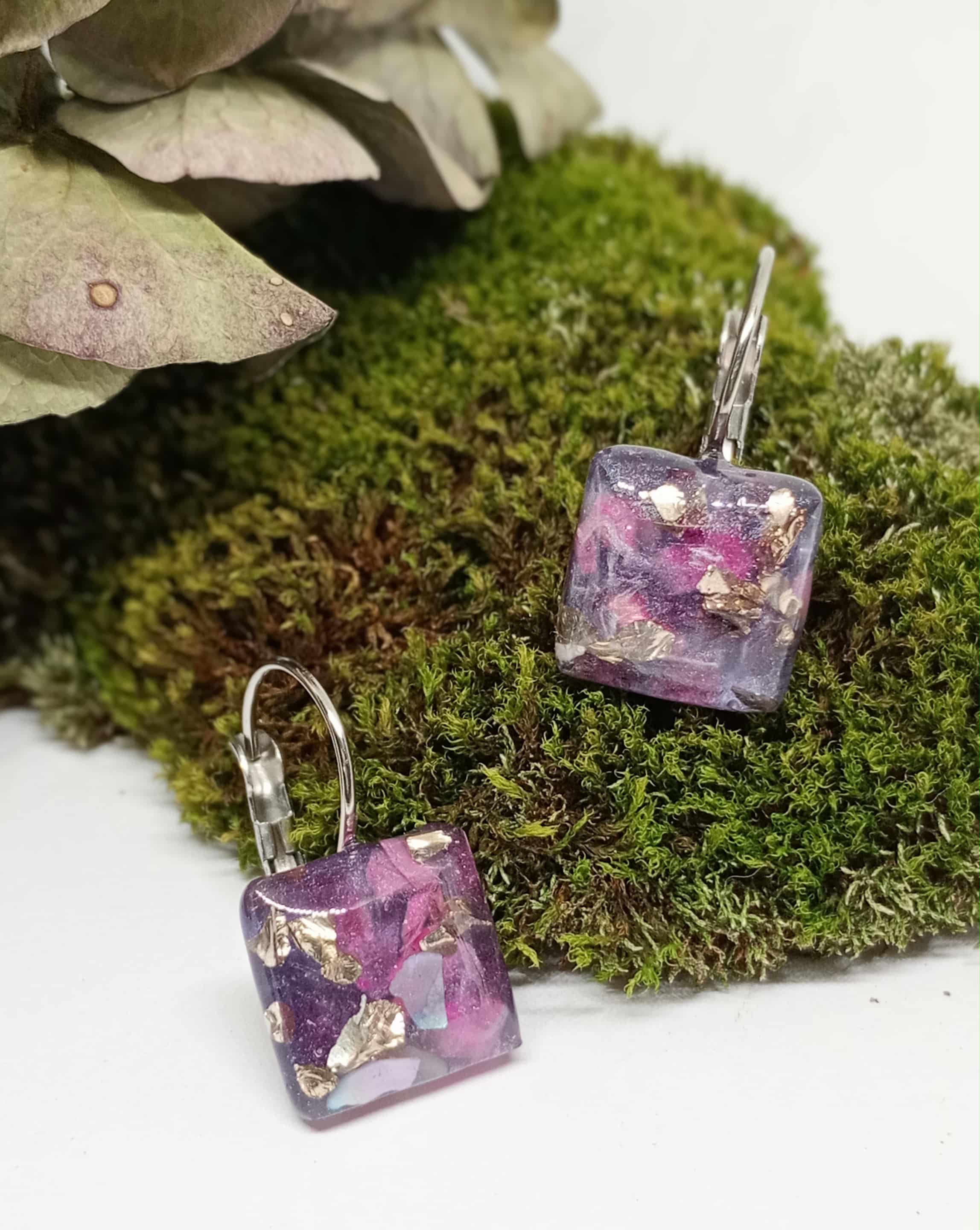 Ručne vyrobené náušničky z epoxidovej živice, trblietok a drobného dekoračného materiálu. Obsahujú ak kamienky ametystu a sušené lupienky kvetov. Zapínanie nerezové.